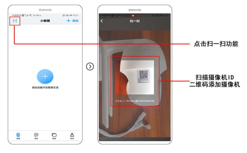 6.進(jìn)入手機(jī)客戶端主界面,點(diǎn)擊左上角的“掃一掃”功能,掃描攝像機(jī)上的ID二維碼,聽到“滴”的一聲,即可添加成功;添加成功后,點(diǎn)擊“設(shè)置”選項(xiàng),選擇“TF存儲卡”選項(xiàng),將攝像機(jī)內(nèi)存卡進(jìn)行格式化;