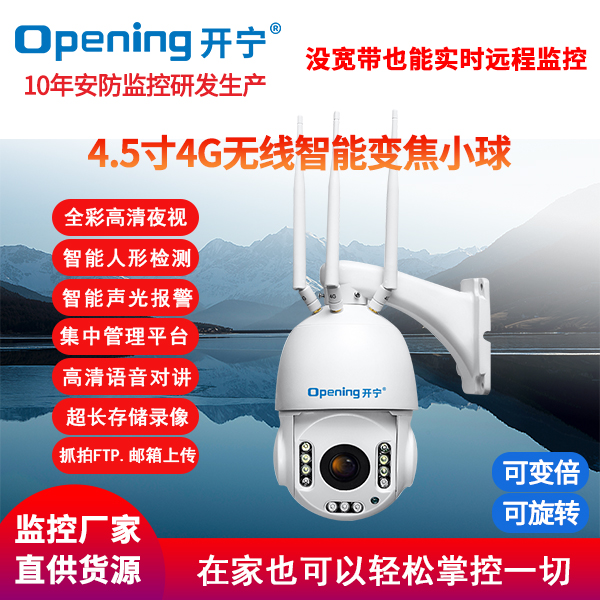 開寧4.5寸4G無線智能30倍變焦小球搭配30倍監(jiān)控專用高清自動變焦鏡頭,可拉遠拉近;水平旋轉(zhuǎn):0°~360°,垂直旋轉(zhuǎn):0°~93°;,4g無線小球水平旋轉(zhuǎn):0°~355°,垂直旋轉(zhuǎn):0°~90°;5顆高效能點陣紅外燈,6顆高效能點陣白光燈,夜視10-100米;高清保真拾音器及高清晰喇叭,可語音對講;