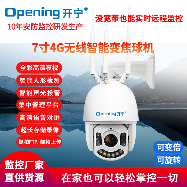 開寧7寸4G無線智能30倍光學(xué)變焦球機采用監(jiān)控專用高清自動變焦30倍光學(xué)變焦鏡頭,監(jiān)控專用高清自動變焦鏡頭,4g無線球機水平旋轉(zhuǎn):0°~360°,垂直旋轉(zhuǎn):0°~90°;6顆大功率點陣紅外燈,6顆大功率遠距離白光燈,夜視距離80-150米;7寸30倍變焦球機,水平360°連續(xù)旋轉(zhuǎn),無監(jiān)視盲區(qū);支持預(yù)置位和巡航;移動偵測報警 Email報警,F(xiàn)TP圖片上傳,手機推送;