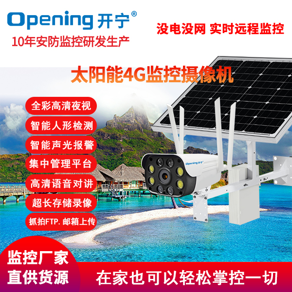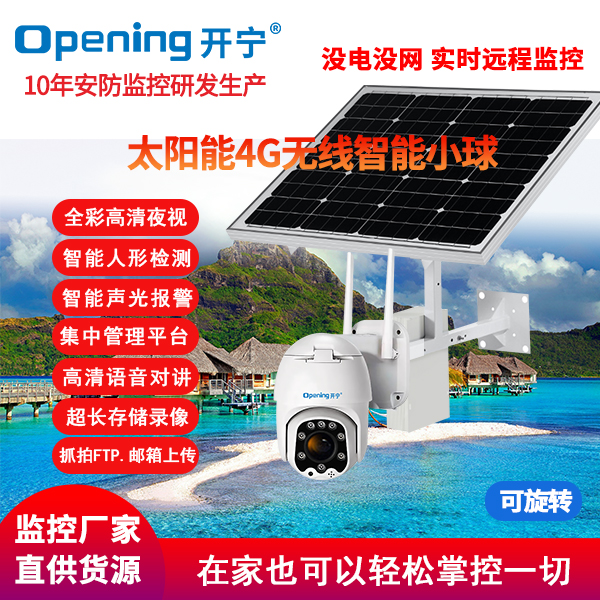 采用開寧7寸4G無線智能30倍光學(xué)變焦球機+開寧太陽能供電系統(tǒng)(含太陽能板和電池,有不同的規(guī)格選擇)組成太陽能4G監(jiān)控系統(tǒng);監(jiān)控專用高清自動變焦30倍光學(xué)變焦鏡頭,監(jiān)控專用高清自動變焦鏡頭,4g無線球機水平旋轉(zhuǎn):0°~360°,垂直旋轉(zhuǎn):0°~90°;6顆大功率點陣紅外燈,6顆大功率遠距離白光燈,夜視距離80-150米;7寸30倍變焦球機,水平360°連續(xù)旋轉(zhuǎn),無監(jiān)視盲區(qū);支持預(yù)置位和巡航;移動偵測報警 Email報警,F(xiàn)TP圖片上傳,手機推送;