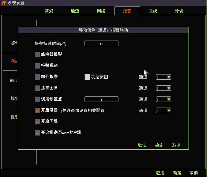 2.鼠標(biāo)移動到系統(tǒng)設(shè)置界面中的“報警-移動偵測”選項,則系統(tǒng)打開硬盤錄像機(jī)移動偵測的界面,并單擊選中任意通道的“啟用”選項,分別配置好布防時間、移動偵測區(qū)域以及移動偵測報警聯(lián)動項,即可開啟該通道的移動檢測功能。(硬盤錄像機(jī)的移動偵測報警聯(lián)動功能可根據(jù)需要進(jìn)行設(shè)置)如下圖所示: