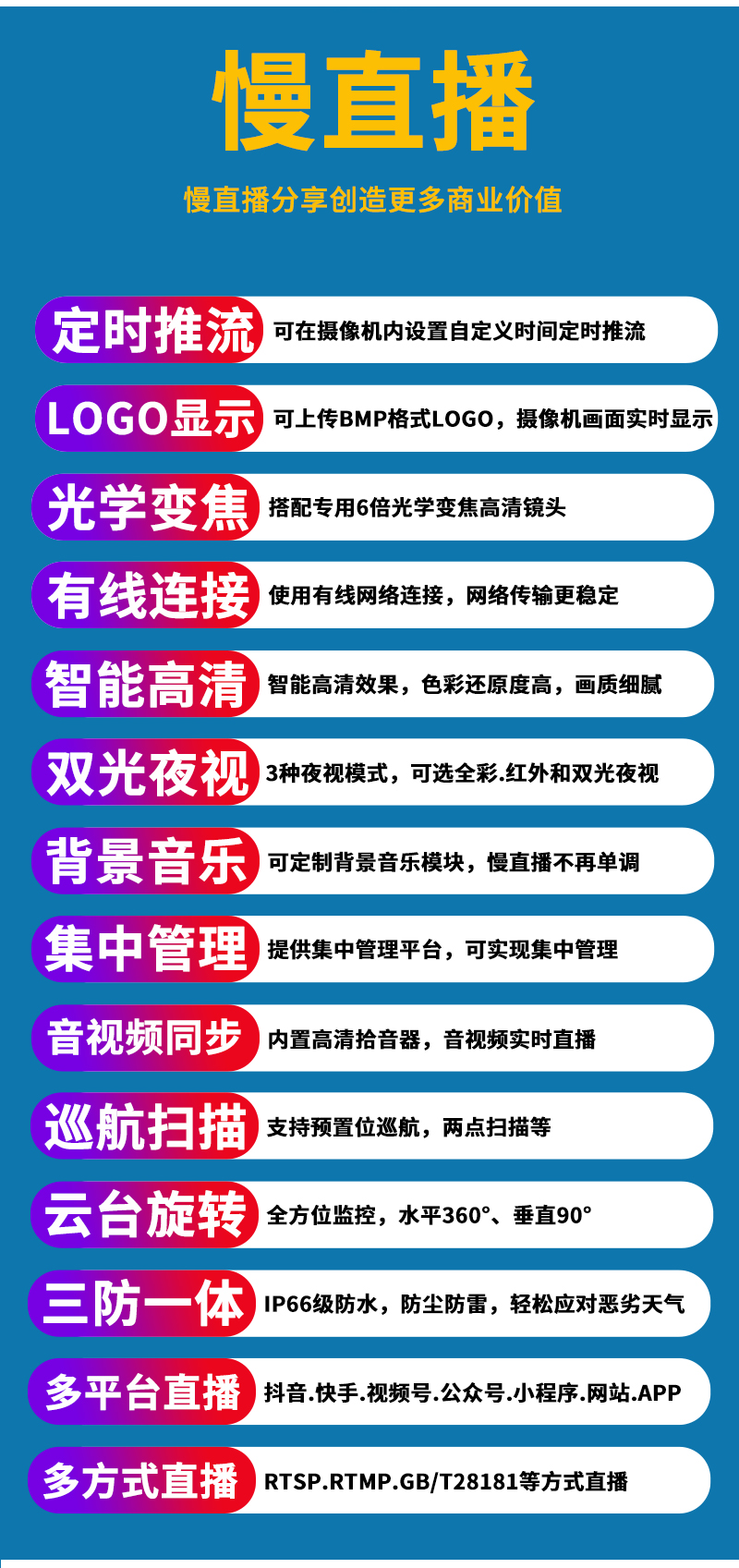 - 1、400萬(wàn)/500萬(wàn)/4K800萬(wàn)/1200萬(wàn)4.5寸6倍全彩慢直播智能高清球機(jī),一個(gè)球機(jī)就是一套慢直播系統(tǒng);支持360度旋轉(zhuǎn),支持預(yù)置點(diǎn)和巡航,6倍光學(xué)變焦,半金屬外觀,IP66防水等級(jí); 2、不僅可以監(jiān)控監(jiān)管錄像,還可以實(shí)時(shí)慢直播分享創(chuàng)造更多商業(yè)價(jià)值; 3、美景中國(guó).城市慢直播.文旅慢直播.融媒體慢直播.央視頻慢直播.交通慢直播.戶外直播等慢直播 4、無需下載安裝APP,簡(jiǎn)單實(shí)用;不限觀看人數(shù),創(chuàng)造更多商業(yè)價(jià)值; 5、RTMP推流直播高清攝像頭;可生成慢直播二維碼,只需掃碼即可觀看慢直播; 6、可接入網(wǎng)站.公眾號(hào).小程序.APP;可對(duì)接抖音.快手.視頻號(hào).京東.淘寶.拼多多等平臺(tái); 7、支持GB/T28181協(xié)議;可接公安.食品.工地.生產(chǎn).教育.畜牧.旅游等監(jiān)管部門平臺(tái); 8、支持對(duì)接網(wǎng)絡(luò)高清硬盤錄像機(jī)(NVR),本地錄像錄音、集中管理多路視頻畫面; 9、支持定制內(nèi)置插卡和錄像機(jī)硬盤同時(shí)視頻錄像;支持定制POE供電; 10、6顆高效能點(diǎn)陣暖光燈,全彩夜視1-80米;6倍光學(xué)變焦高清鏡頭; 11、內(nèi)置高清保真拾音器,聲音視頻同步慢直播;DC12V供電; 12、免費(fèi)提供集中管理平臺(tái),可實(shí)現(xiàn)集中管理慢直播設(shè)備,有效提高工作效率; 13、慢直播首選4K800萬(wàn)智能全彩超高清智能球機(jī),美景中國(guó)、實(shí)景中國(guó)慢直播好幫手! 14、水平360度無限位旋轉(zhuǎn),垂直90度;水平轉(zhuǎn)速40度/秒,垂直轉(zhuǎn)速30度/秒;支持256個(gè)預(yù)置位 8組巡航8組掃描,支持水平掃描,2點(diǎn)區(qū)域掃描,隨機(jī)掃描;