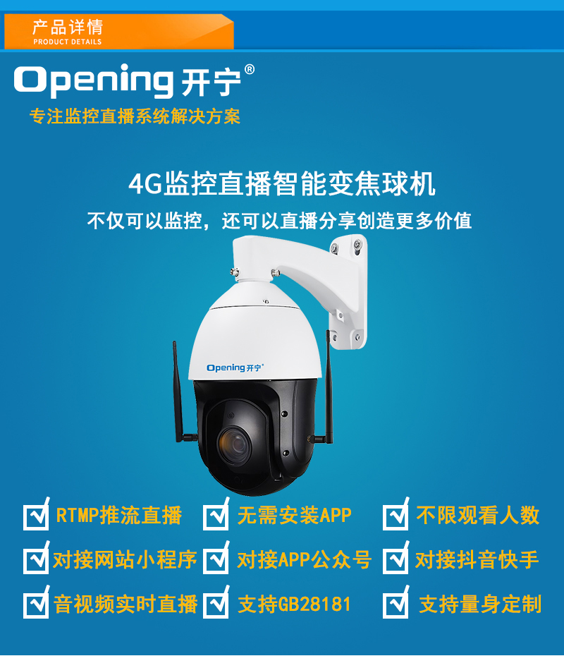 2、內(nèi)置智能4G模塊,沒(méi)有寬帶網(wǎng)絡(luò)的地方也能實(shí)現(xiàn)實(shí)時(shí)監(jiān)控直播;另外選配太陽(yáng)能供電系統(tǒng)可實(shí)現(xiàn)無(wú)電無(wú)網(wǎng)實(shí)時(shí)監(jiān)控直播;
