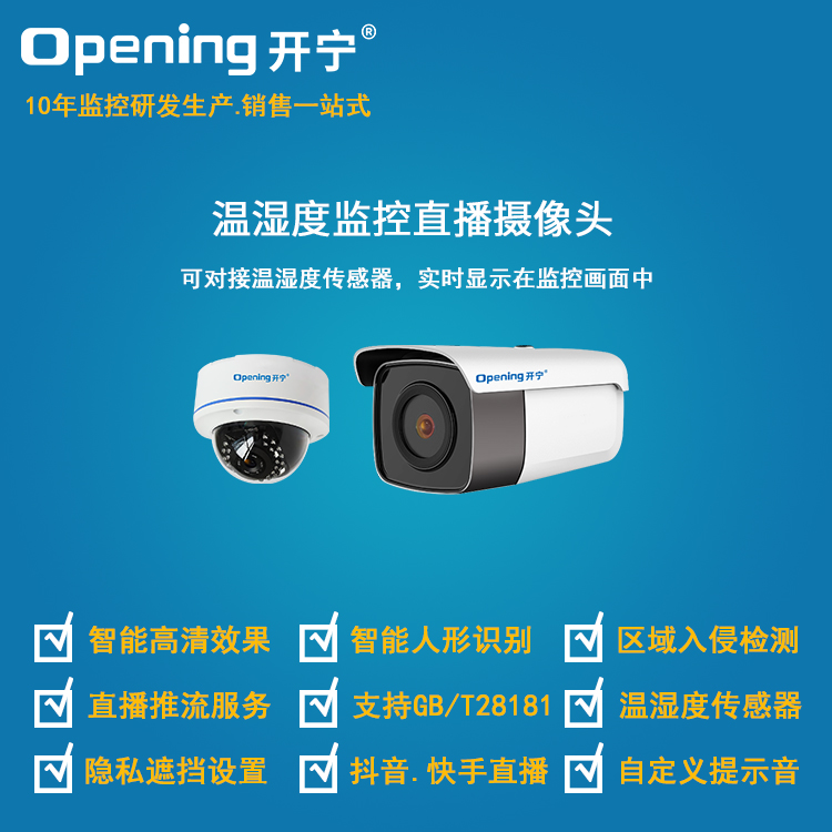 - 1、200萬溫濕度監(jiān)控直播攝像頭,一個直播攝像頭就是一套監(jiān)控直播系統(tǒng);可接溫濕度傳感器,視頻畫面實時顯示溫濕度數(shù)據(jù);