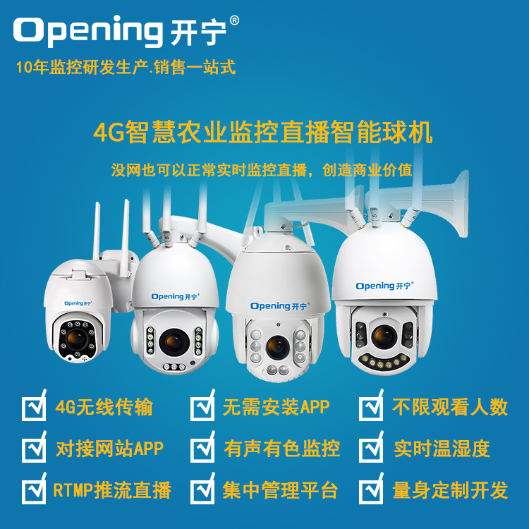 - 1、4G智慧農(nóng)業(yè)直播監(jiān)控球機,一個球機就是一套監(jiān)控直播系統(tǒng);支持360度旋轉(zhuǎn),支持預(yù)置點和巡航,30倍光學變焦,IP66防水等級;可接溫濕度傳感器;