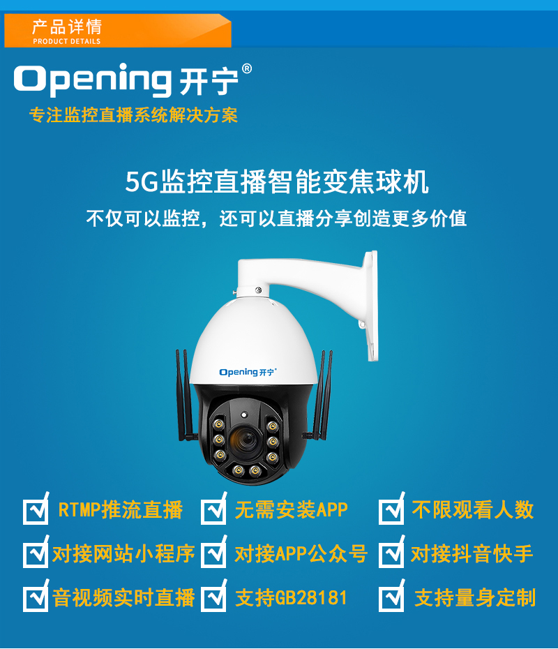 2、內(nèi)置智能5G模塊,沒有寬帶網(wǎng)絡(luò)的地方也能實(shí)現(xiàn)實(shí)時(shí)監(jiān)控直播;另外選配太陽能供電系統(tǒng)可實(shí)現(xiàn)無電無網(wǎng)實(shí)時(shí)監(jiān)控直播;