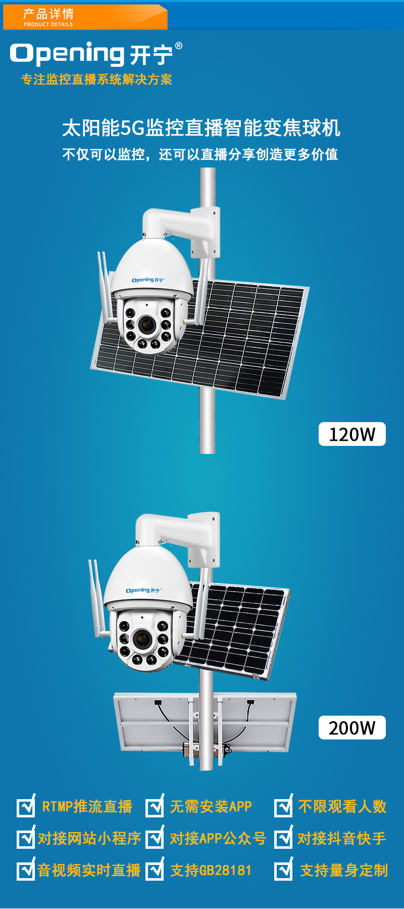 2、內(nèi)置智能5G模塊,沒有寬帶網(wǎng)絡的地方也能實現(xiàn)實時監(jiān)控直播;另外選配太陽能供電系統(tǒng)可實現(xiàn)無電無網(wǎng)實時監(jiān)控直播