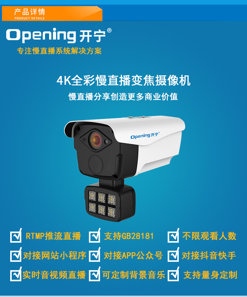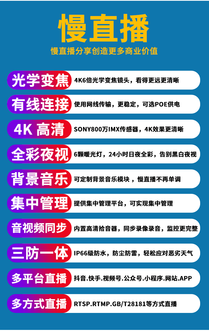 - 1、300萬/500萬/800萬4K慢直播智能全彩高清攝像機,一個攝像機就是一套慢直播系統(tǒng);
