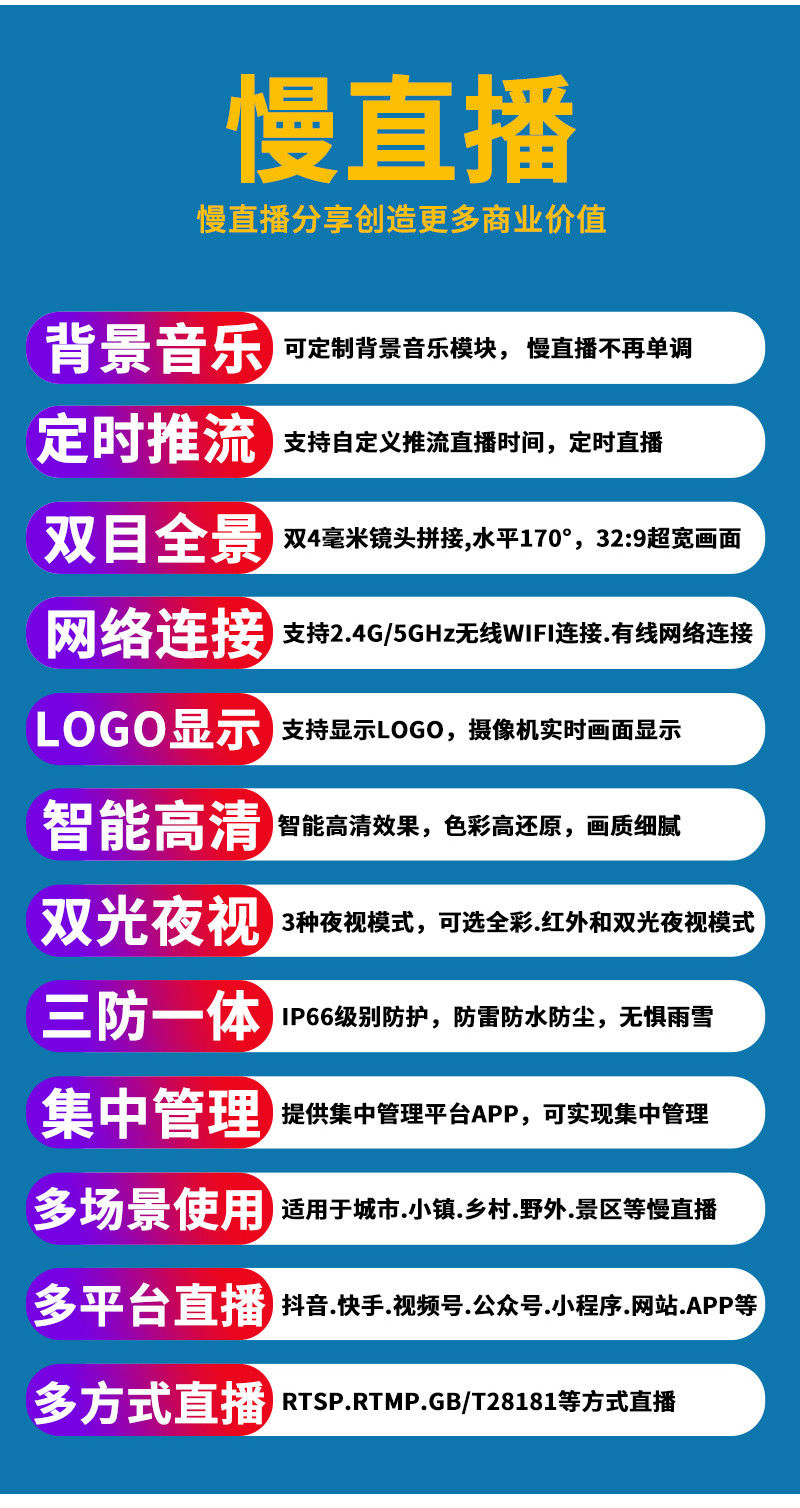 3、景點(diǎn)直播.美麗鄉(xiāng)村.城市慢直播.農(nóng)業(yè)慢直播.文旅慢直播.融媒體慢直播.戶(hù)外直播等慢直播;