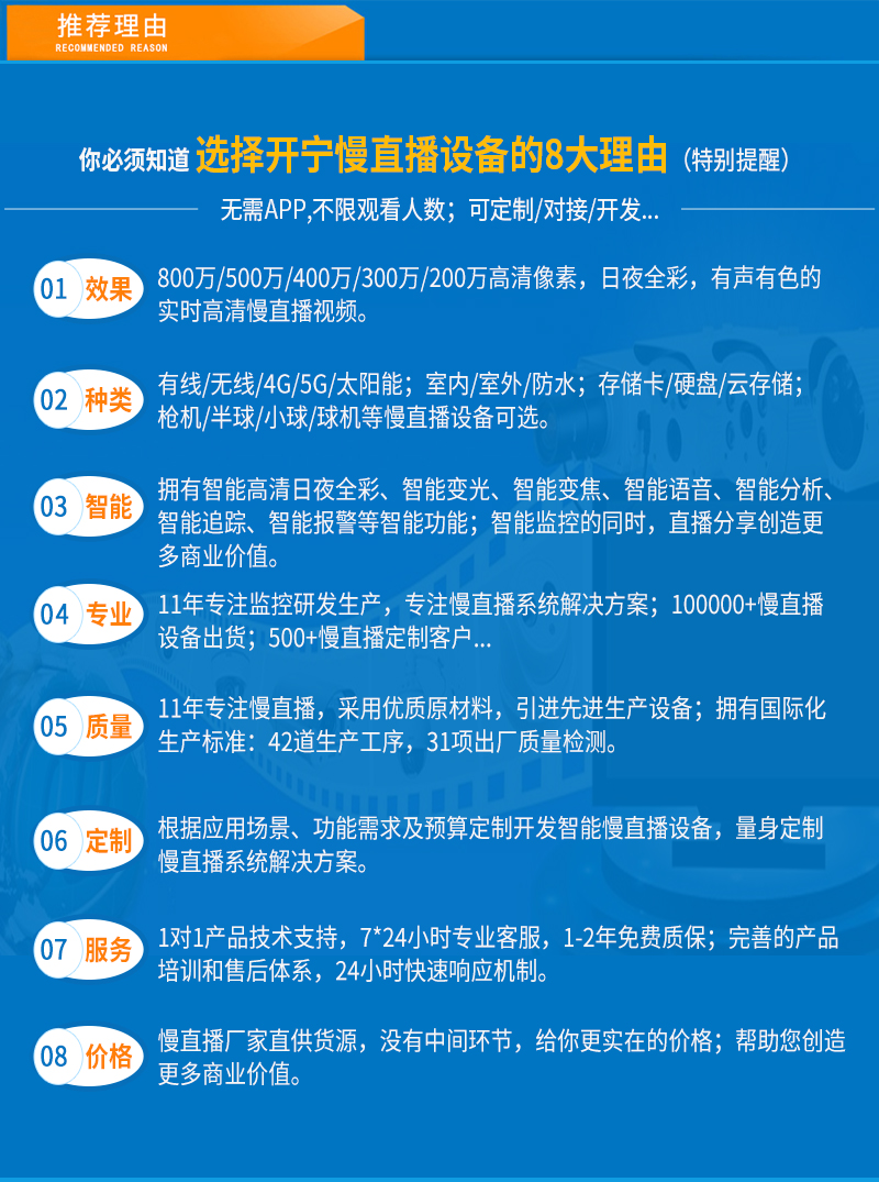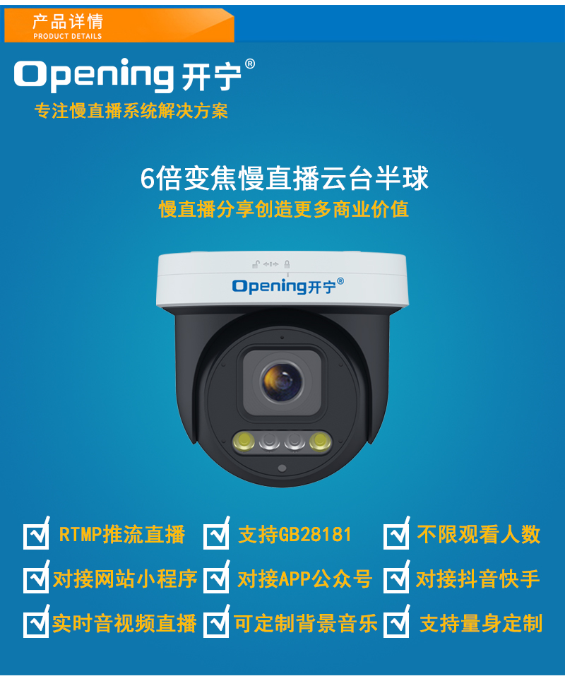 - 1、4K800萬(wàn)6倍變焦有線慢直播智能云臺(tái)半球,一個(gè)云臺(tái)半球就是一套慢直播系統(tǒng);支持水平355度和垂直90度旋轉(zhuǎn); 2、不僅可以監(jiān)控監(jiān)管錄像,還可以實(shí)時(shí)慢直播分享創(chuàng)造更多商業(yè)價(jià)值; 3、美景中國(guó).智慧景區(qū).城市慢直播.美麗鄉(xiāng)村.融媒體慢直播.央視頻慢直播.戶(hù)外慢直播等慢直播; 4、無(wú)需下載安裝APP,簡(jiǎn)單實(shí)用;不限觀看人數(shù),創(chuàng)造更多商業(yè)價(jià)值; 5、RTMP推流直播高清攝像頭;可生成慢直播二維碼,只需掃碼即可觀看慢直播; 6、可接入網(wǎng)站.公眾號(hào).小程序.APP;可對(duì)接抖音.快手.視頻號(hào).京東.淘寶.拼多多等平臺(tái); 7、支持GB/T28181協(xié)議;可接公安.食品.工地.生產(chǎn).教育.畜牧.旅游等監(jiān)管部門(mén)平臺(tái); 8、高清慢直播、本地錄像錄音、報(bào)警多功能于一體;支持64/128G內(nèi)存卡; 9、15顆點(diǎn)陣紅外燈,15顆點(diǎn)陣白光燈,6倍變焦高清鏡頭,夜視5-65米; 10、APP可選擇紅外模式、全彩模式和智能模式三種模式其中一種模式; 11、內(nèi)置高清保真拾音器,有聲有色實(shí)時(shí)直播;高清晰大功率喇叭,APP語(yǔ)音對(duì)講;DC12V供電; 12、免費(fèi)提供集中管理平臺(tái),可實(shí)現(xiàn)集中管理慢直播設(shè)備,有效提高工作效率; 13、智能人形檢測(cè)報(bào)警、自定義報(bào)警語(yǔ)音,手機(jī)推送。