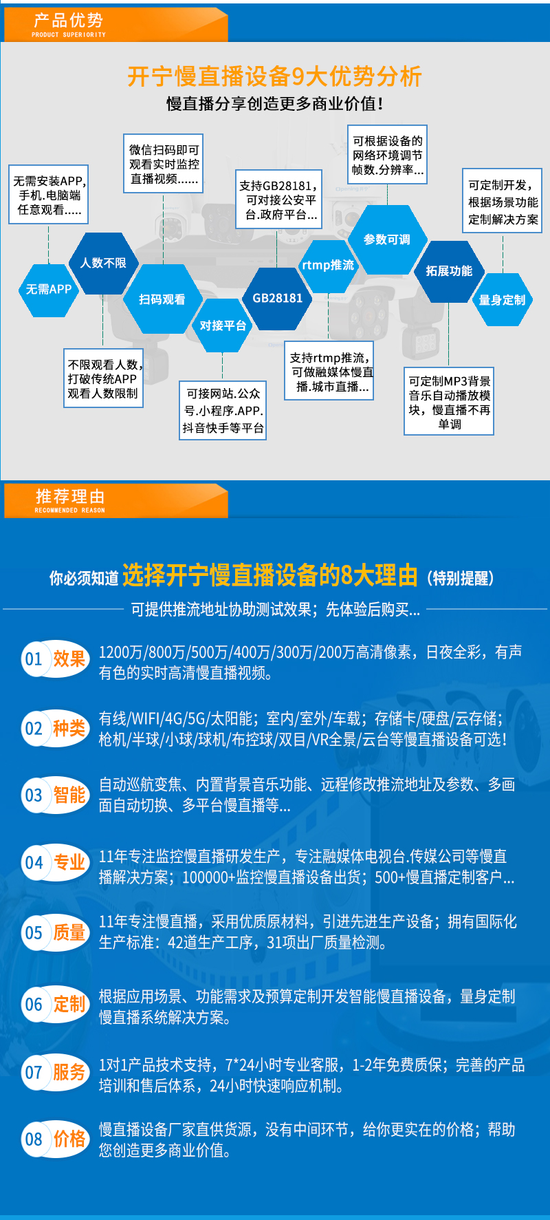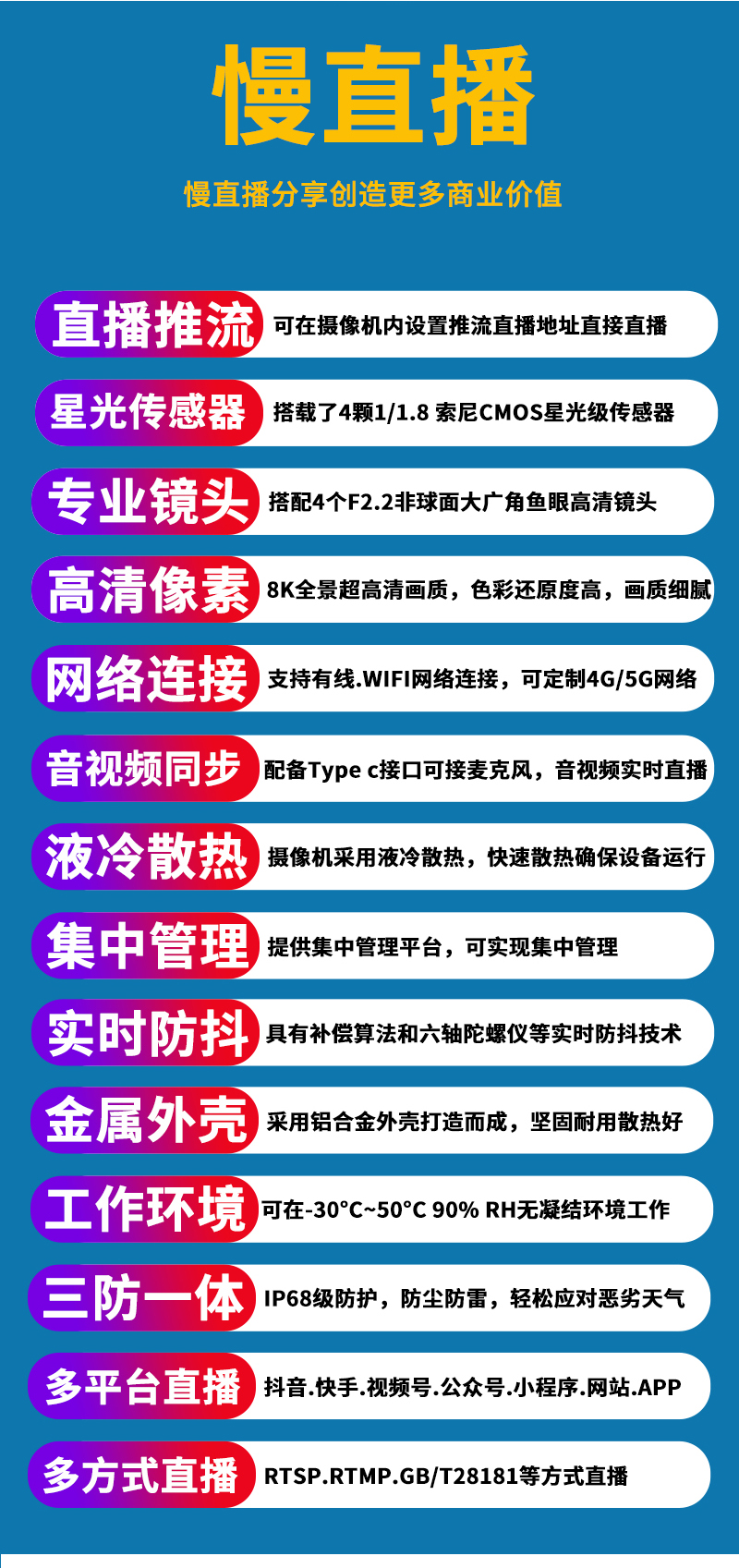 7.直播分辨率:7680*3840@30幀 ;5400*2700@30幀;3840*1920@30幀@60幀,支持H.265/H.264編碼,RTMP/RTMPS/RTSP直播協(xié)議,支持7x24小時;