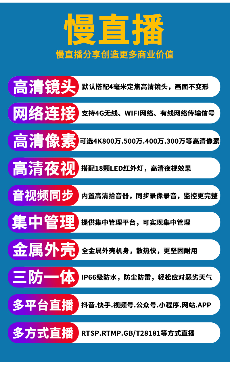 - 1、300萬(wàn)/500萬(wàn)/4K800萬(wàn)無(wú)畸變有線(xiàn)/4G慢直播車(chē)載攝像機(jī),一個(gè)攝像機(jī)就是一套慢直播系統(tǒng);