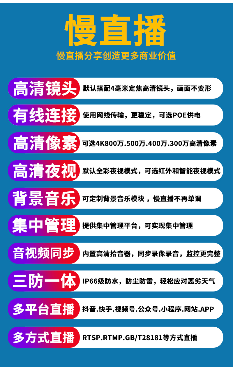 - 1、300萬/500萬/4K800萬/1200萬慢直播智能全彩高清無畸變攝像機,一個攝像機就是一套慢直播系統(tǒng);