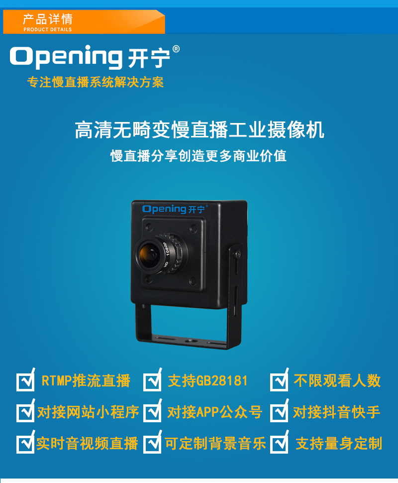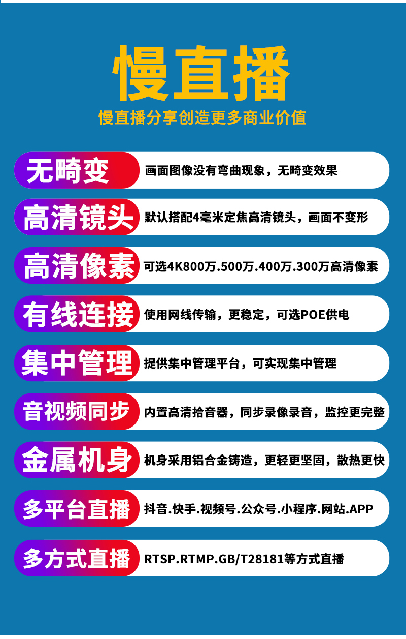 - 1、300萬/500萬/800萬紅外無畸變慢直播工業(yè)方塊攝像機(jī),一個攝像機(jī)就是一套慢直播系統(tǒng);