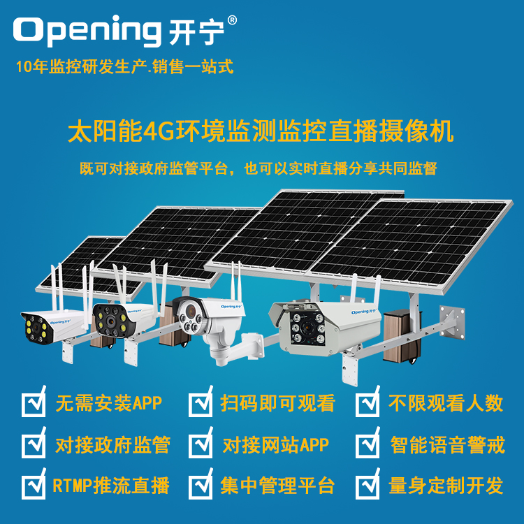 - 1、太陽能4G環(huán)境監(jiān)測直播監(jiān)控攝像機,一個攝像機就是一套監(jiān)控直播系統(tǒng);政府監(jiān)管食品好幫手;