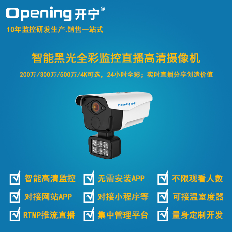 - 1、智能黑光全彩監(jiān)控直播高清攝像機,一個攝像機就是一套監(jiān)控直播系統(tǒng);IP66防水等級;