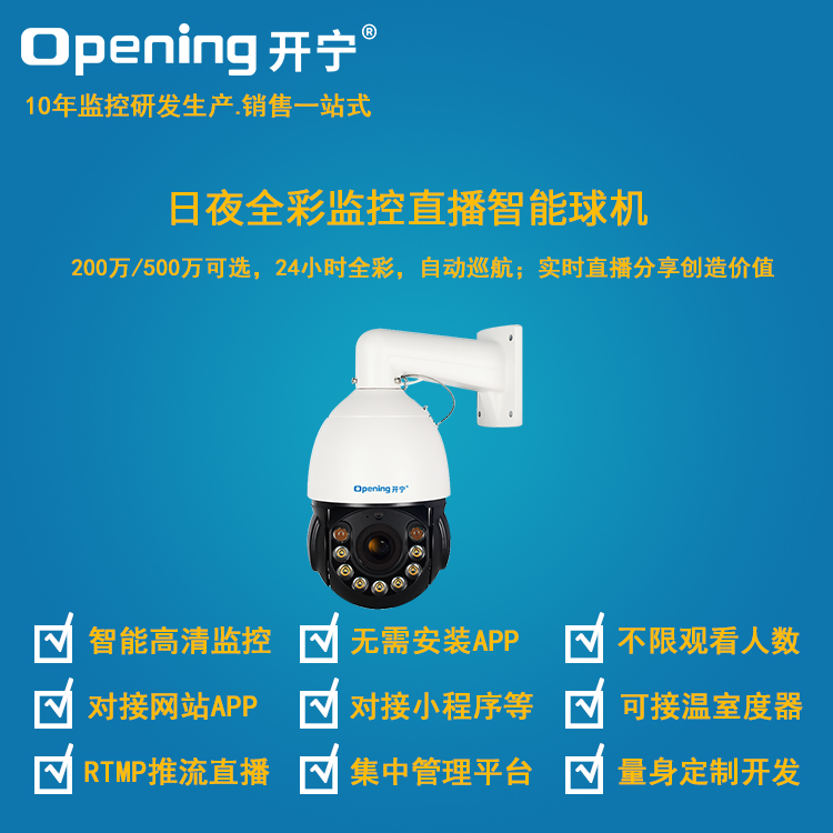 - 1、日夜全彩監(jiān)控直播智能球機(jī),一個球機(jī)就是一套監(jiān)控直播系統(tǒng);支持360度旋轉(zhuǎn),支持預(yù)置點和巡航,30倍光學(xué)變焦,IP66防水等級;