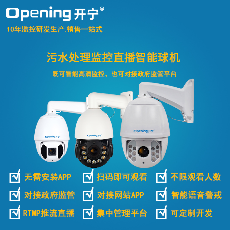 - 1、污水處理監(jiān)控直播攝像機(jī),一個球機(jī)就是一套監(jiān)控直播系統(tǒng);支持360度旋轉(zhuǎn),支持預(yù)置點和巡航,30倍光學(xué)變焦,IP66防水等級;